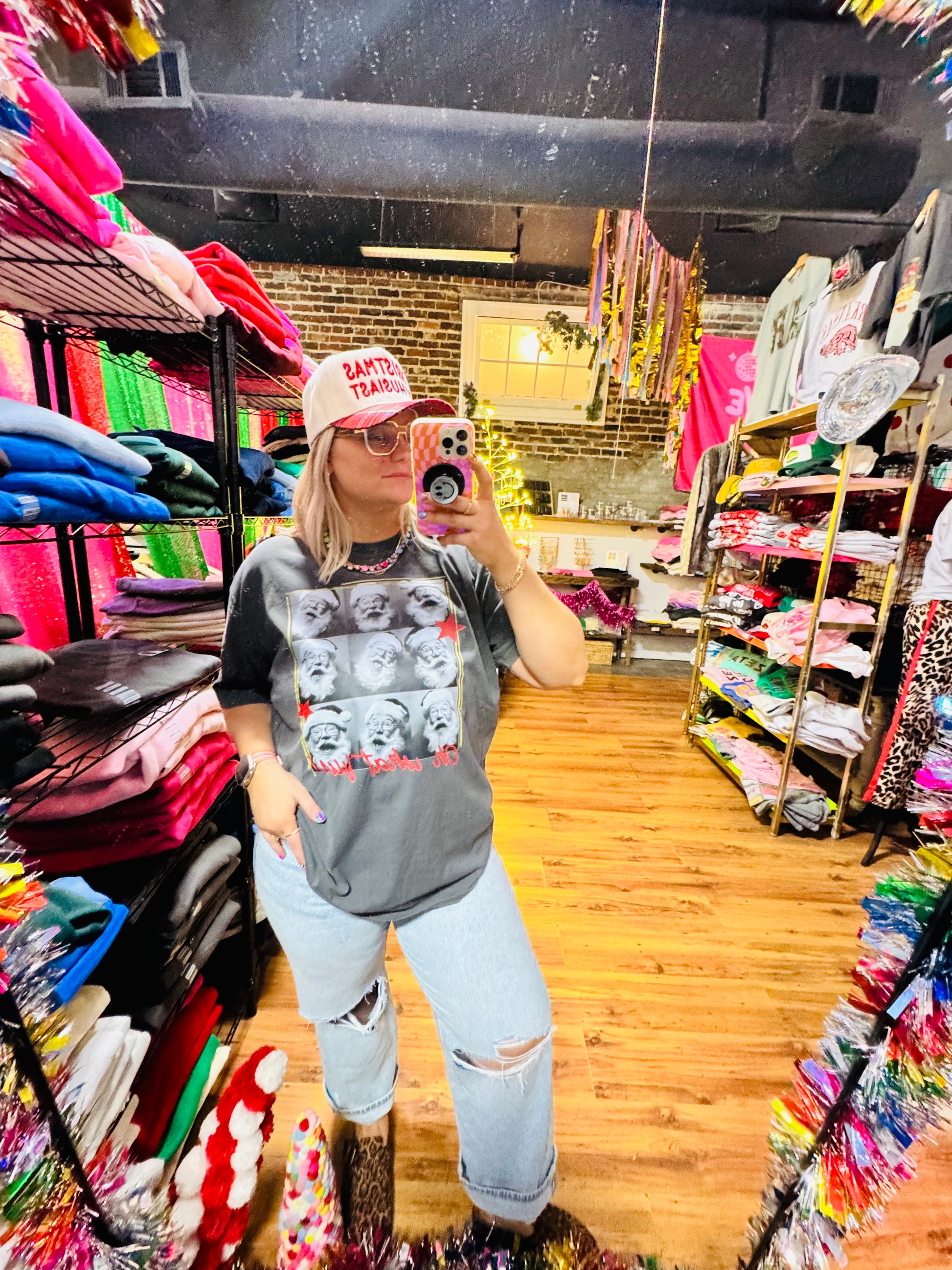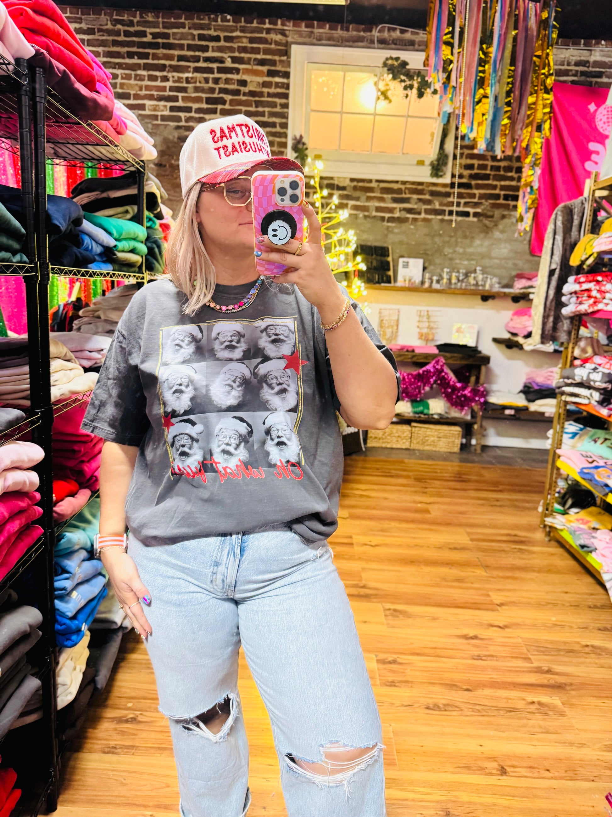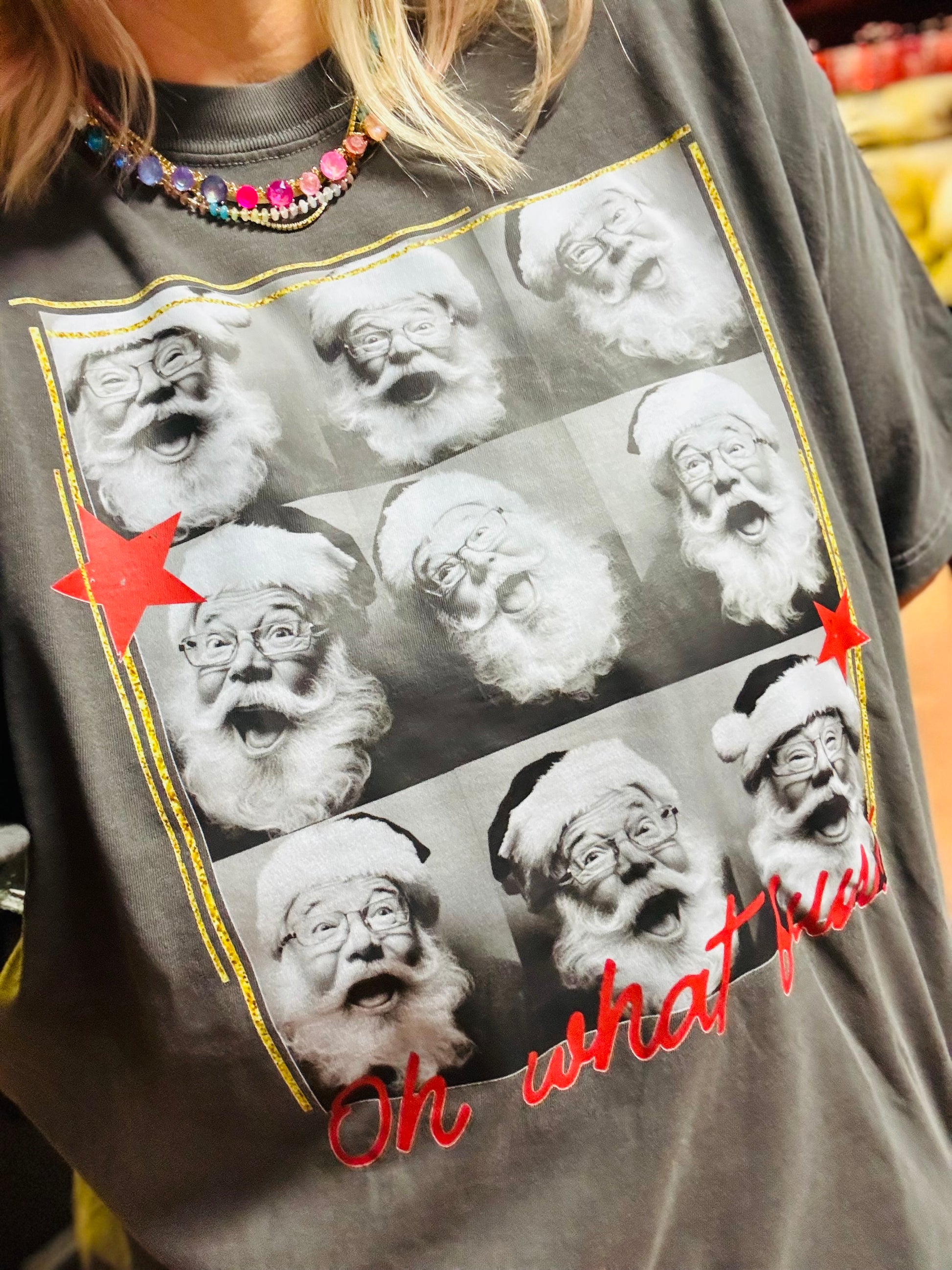 Bring some extra holiday cheer with our Oh What Fun tee or sweatshirt! Featuring Santa selfies, this fun design captures the joy and spirit of the season. Made with comfortable materials, it's the perfect addition to your festive wardrobe. Spread holiday joy with every wear. Available in various sizes.