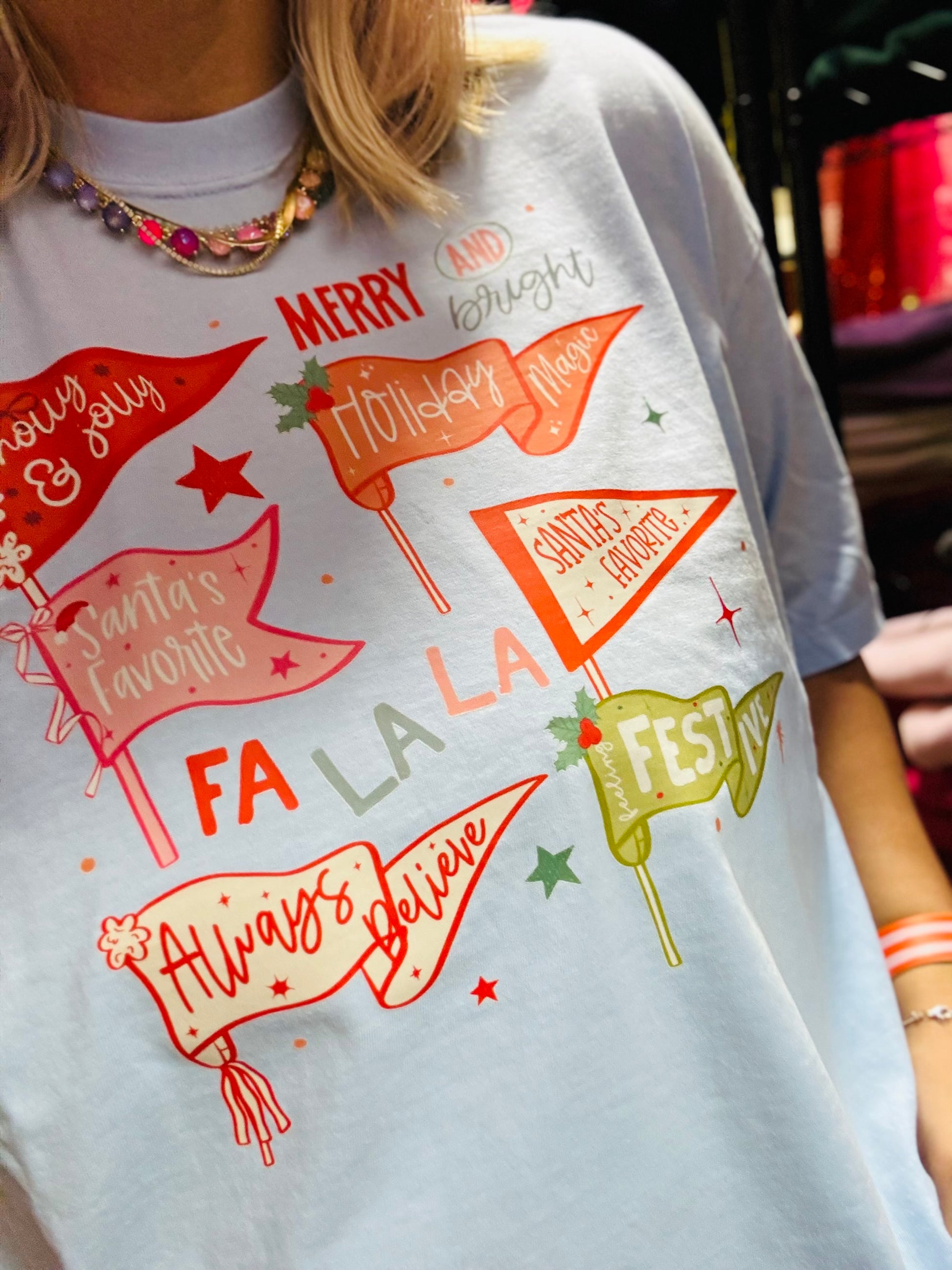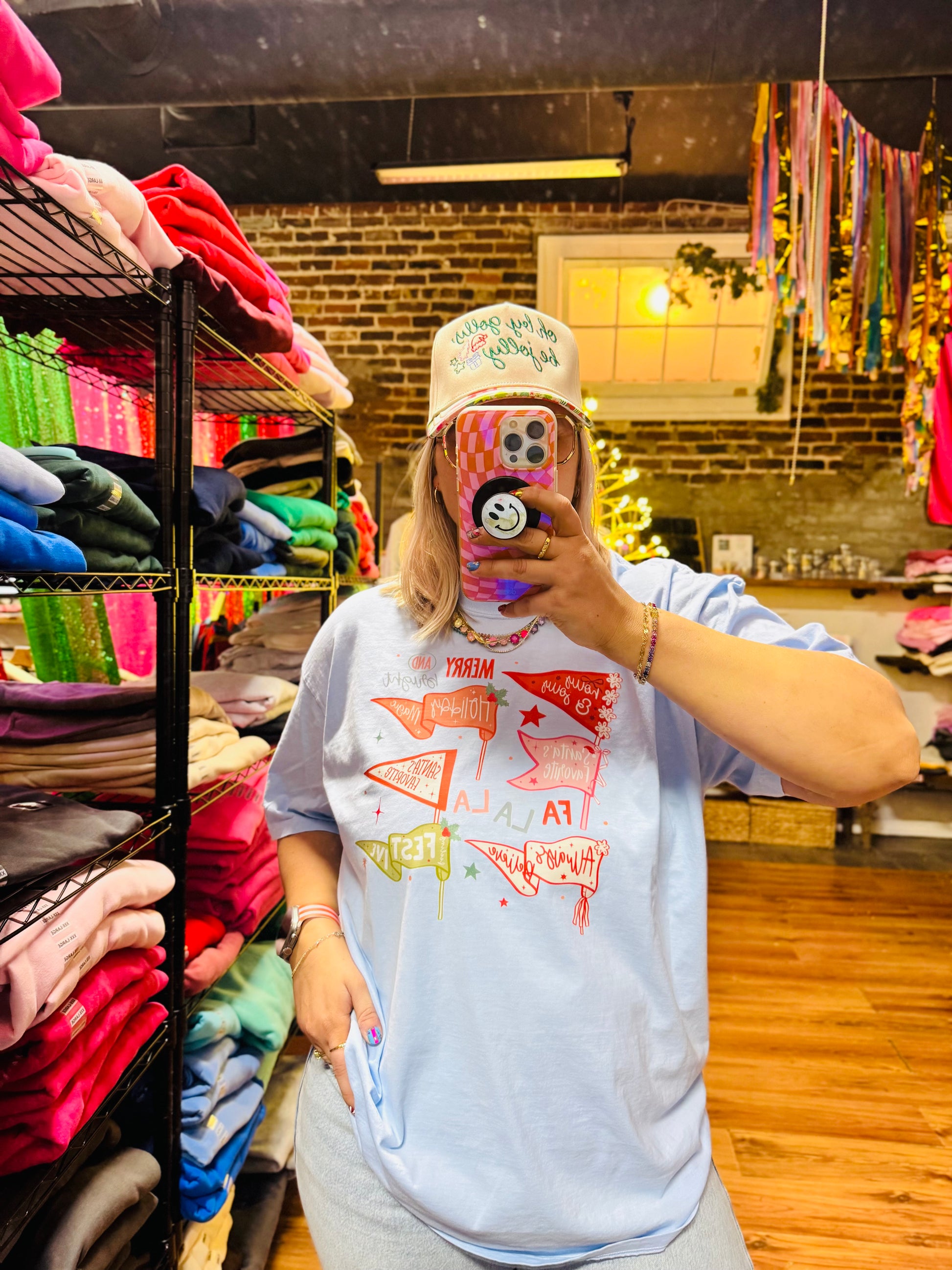 Celebrate the holiday season with our Christmas Flags! Available as a tee or sweatshirt, each piece is adorned with festive pennant flags featuring classic Christmas sayings. Made with comfort and style in mind, these flags are the perfect way to spread some holiday cheer.