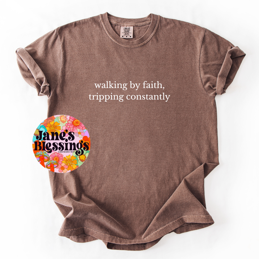 This tee boldly displays the phrase "walking by faith, tripping constantly," serving as a humorous reminder to stay strong and persevere through life's struggles. With its comfortable fabric and powerful message, this shirt is perfect for anyone looking for a daily dose of motivation.