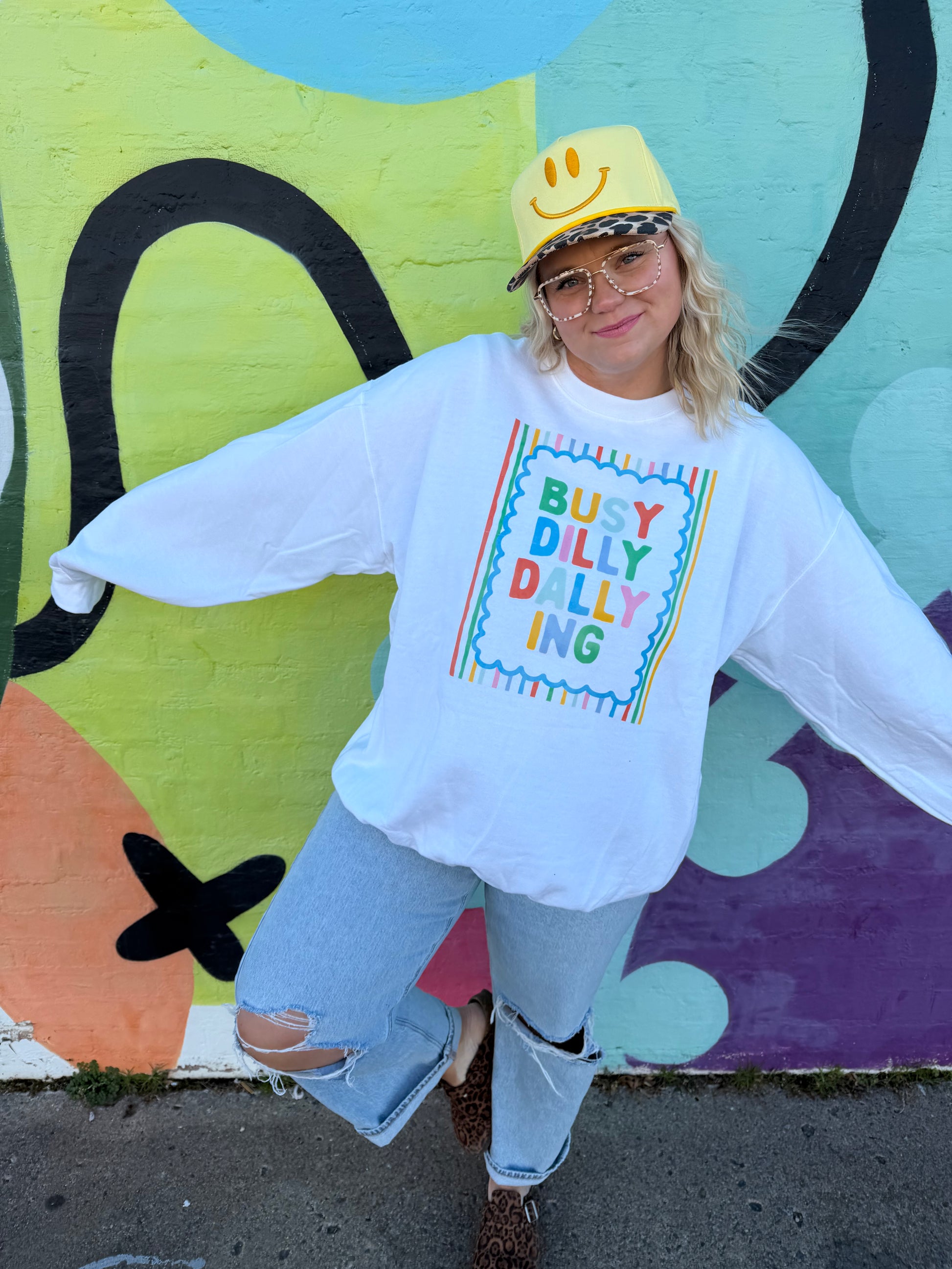 Embrace your inner procrastinator with this fun sweatshirt featuring bold, vibrant lettering that declares "Busy Dilly Dallying" across the front. Perfect for those who appreciate a good laugh and aren't afraid to own their leisurely pace, this cozy piece combines comfort with personality. The bright, eye-catching colors make it a standout addition to any casual wardrobe. Whether you're actually taking your time or just want to send a humorous message, this sweatshirt is your new go-to for laid-back style with a wink and a smile.