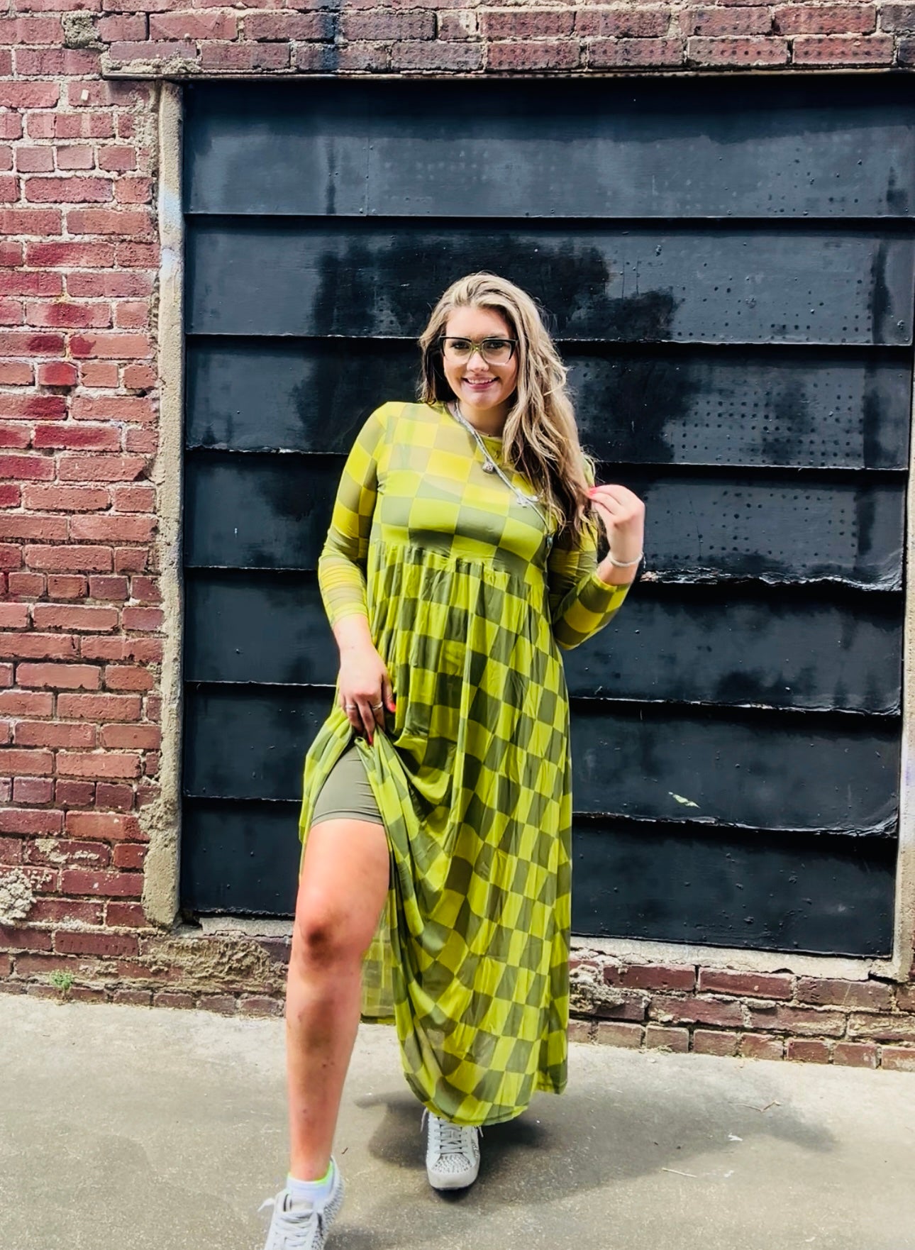 Meet the Green Check Dress that's made for the girls who always find the fun (and look insanely good doing it). This green on green moment brings all the same vibes you loved from our viral Having the Most Fun Mesh Dress, now with a moodier twist. She’s bold, breathable, and effortlessly cool, with her green checker print that moves with you. Size up for that oversized, chill fit or rock it fitted for full main character glow.